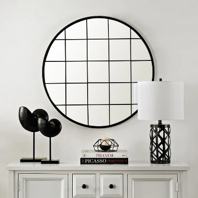 Give your décor a touch of geometric intrigue with this Simmie Mirror. Designed with a black grid overlay over its shining mirror base, Simmie brings delightful decorative depth to any contemporary interior. Care Instructions: Dust with a soft, dry cloth. Do not use abrasive cleaner. To clean mirror, spray a small amount of glass cleaner onto a lint-free cloth and wipe mirror clean.